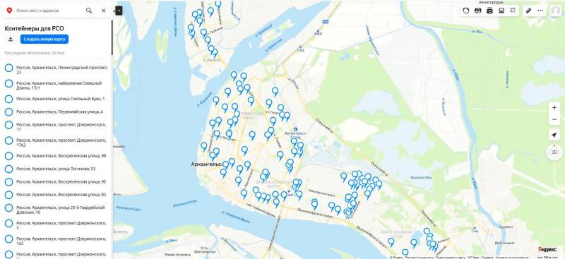 Для удобства жителей Архангельска на сервисе Яндекс.Карты теперь размещены адреса, где установлены контейнеры для раздельного накопления отходов.
