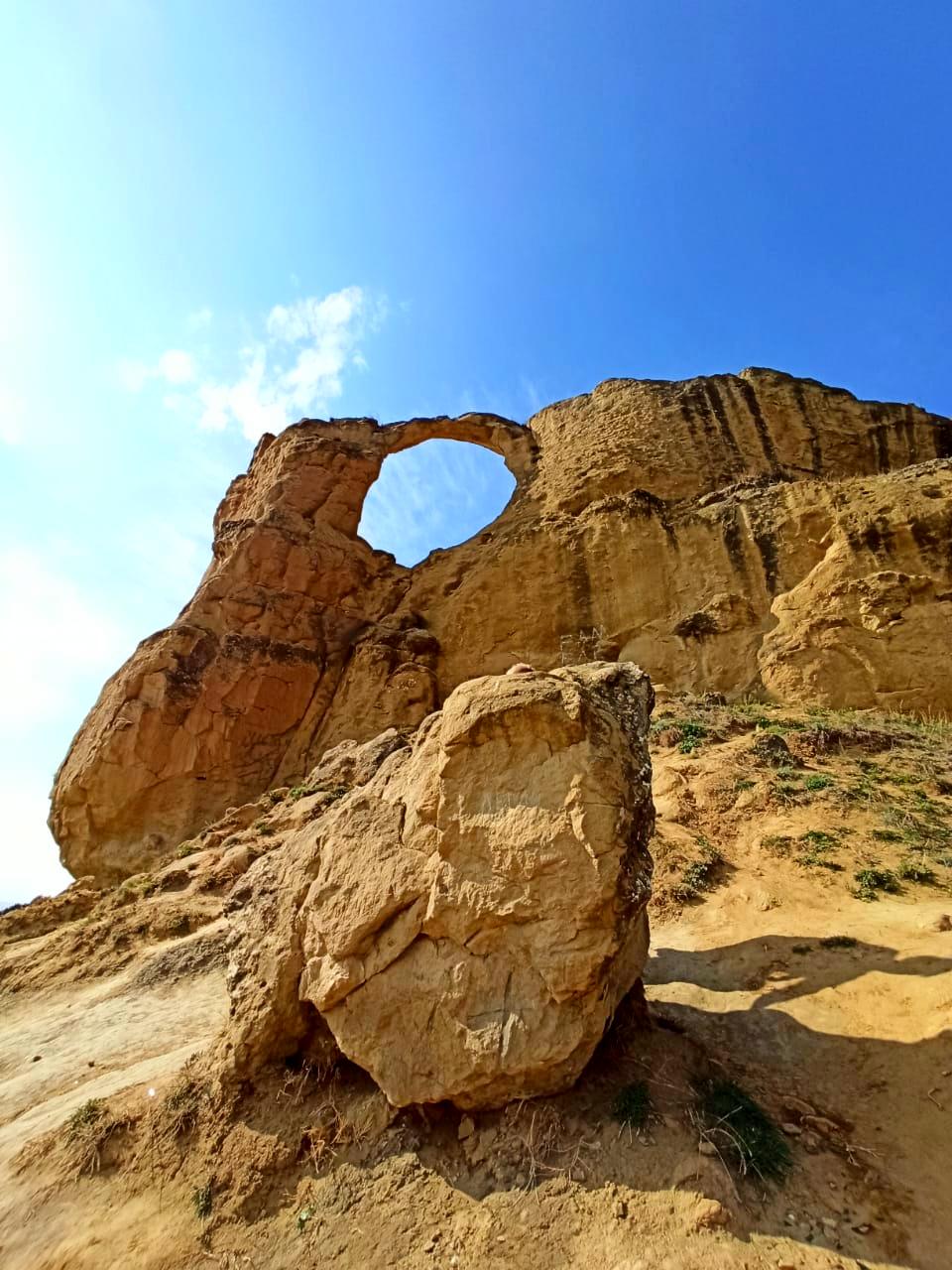Пока мы парковались, на самую верхнюю часть «Кольца» въехал на горячем скакуне какой-то сорвиголова, погарцевал и умчался. Мы стали подниматься к этому великолепному чуду природы – дождь и ветер за долгие годы проделали в мягком песчанике Боргустанского хребта почти круглое отверстие диаметром порядка 8 метров. Красота!